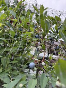 ブルーベリーがたくさん生りました。めちゃくちゃ暑い中、鳥よけの網をくぐって一粒ずつ採ります。濃い色で、大きい粒のものは、甘くておいしい。夢中で採っていると、つい小さめのものを採ってしまうのですが、すこし酸っぱいですね。